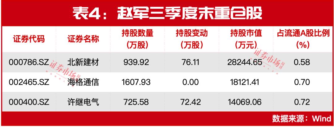 相对“高毅天团”而言,淡水泉的赵军、重阳投资的裘国根、景林资产的蒋锦志则公开持仓较少。三季度末,赵军公开重仓了3家公司,对北新建材、许继电气进行了进一步增持,海格通信的持股数则较上一季度没有变动(见表4)。