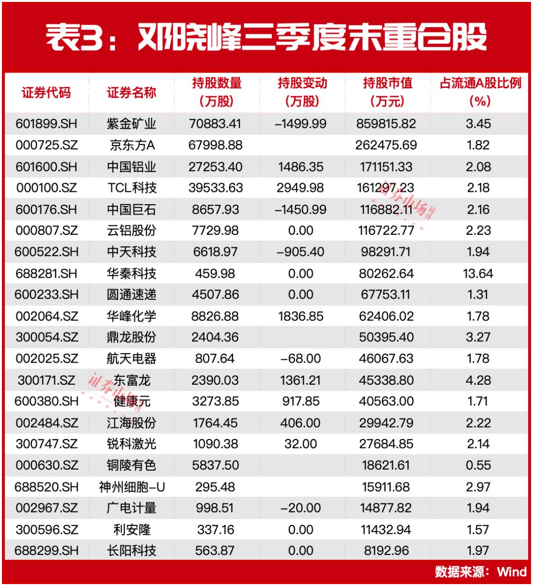 与冯柳继续加仓第一大重仓股海康威视不同,邓晓峰本期则继续对其第一大重仓股紫金矿业进行了部分减持(见表3)。此外,京东方A、中国铝业、TCL科技3家公司三季度期间则得到了邓晓峰较大规模的增持或建仓,其中中国铝业自其建仓以来的表现最佳,今年一季度建仓至今,累计上涨已超30%。