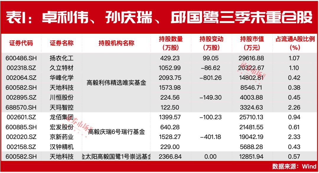 卓利伟管理的高毅利伟精选唯实基金、孙庆瑞管理的高毅庆瑞6号瑞行基金、邱国鹭管理的金太阳高毅国鹭1号崇远基金3只产品公开持股规模相对偏低,季度末分别重仓了6家公司、4家公司和1家公司,持股市值分别为8.06亿元、7.19亿元、1.29亿元(见表1)。