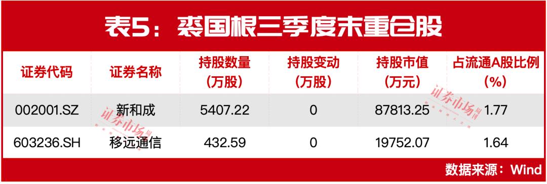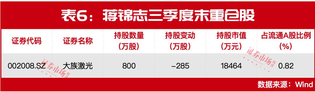 裘国根三季度继续对新和成、移远通信进行了无变动式持股,蒋锦志虽然仍对大族激光公开重仓,但相较二季度末,进行了285万股的减持(见表5、表6)。