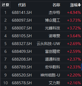 科创板早盘探底回升。相关指数中,早盘一度下跌近1%的科创100指数(000698)拉升翻红,成分股涨跌互现。截至发稿,其中,杰华特涨近5%,博众精工、光峰科技、诺唯赞涨超3%,云从科技-UW、富创精密、道通科技、宏华数科、神州细胞-U、艾力斯等涨逾2%。