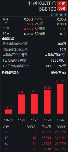 从资金流向上看,科创100ETF(588190)近期获资金加速净流入。其中昨日资金净流入额超1.2亿元,近5个交易日累计资金净流入额超4亿元。与此同时,该ETF最新规模超23亿元,再创上市以来新高。