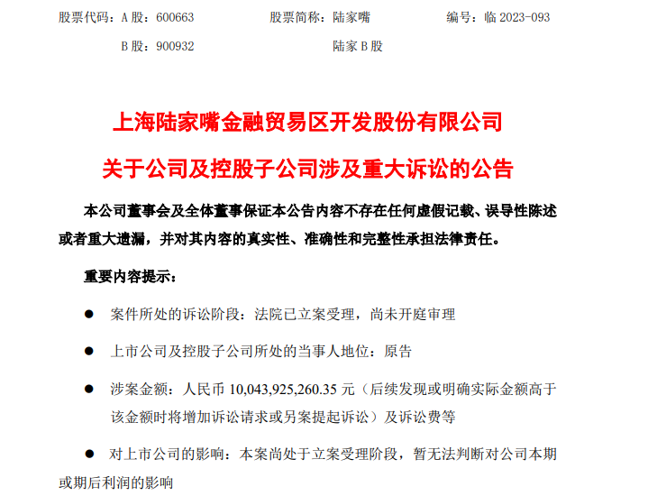 陆家嘴请求法院判令苏钢集团承担赔偿人民币100.44亿元(后续发现或明确实际金额高于该金额时将增加诉讼请求或另案提起诉讼)的侵权责任,并请求判令另外4名被告承担连带责任。近日,陆家嘴宣布收到通知,法院已立案受理。