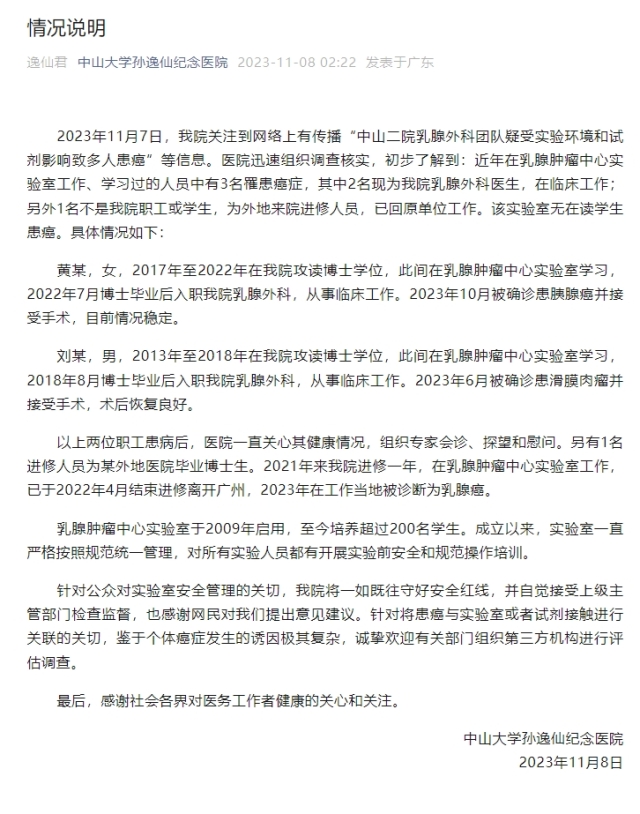 11月8日,中山大学孙逸仙纪念医院官方发布《情况说明》,回应了网络上有关“中山二院乳腺外科团队疑受实验环境和试剂影响致多人患癌”的信息。医院表示,近年在医院乳腺肿瘤中心实验室工作、学习过的人员中有3名罹患癌症,无在读学生患癌。针对将患癌与实验室或者试剂接触进行关联的关切,鉴于个体癌症发生的诱因极其复杂,诚挚欢迎有关部门组织第三方机构进行评估调查。