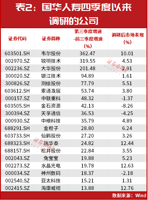 Wind统计显示,10月以来至今(11月7日,下同)国华人寿累计共参与了37家上市公司的机构调研,在这些公司中,有26家公司第三季度归母净利润要好于其前三季度整体的表现,占比超过七成。其中,有20家的第三季度归母净利润同比增速要比前三季度高出10个百分点及其以上。最为典型的是半导体设计公司韦尔股份,公司第三季度归母净利润同比增长279.61%,前三季度则为-82.86%(见表2)。