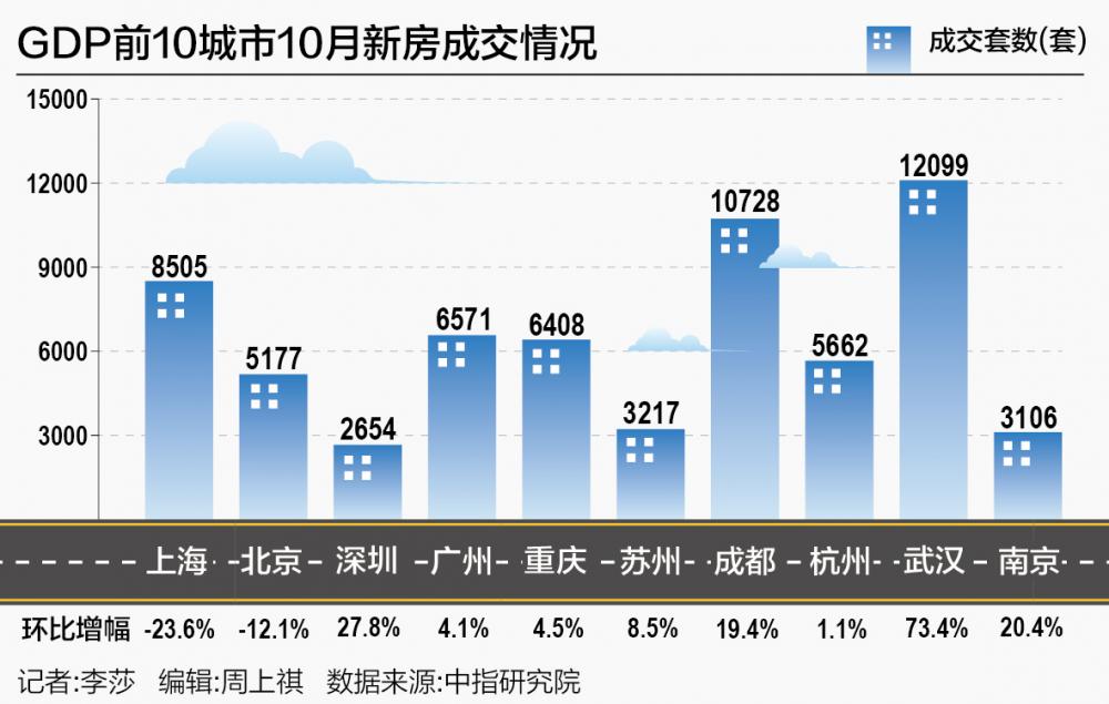 为此,21世纪经济报道记者以中指数据为基础,考察今年上半年GDP前10城市,即北京、上海、深圳、广州、重庆、苏州、成都、杭州、武汉、南京的10月楼市销售和房价情况,并由此讨论市场变化与楼市走向。