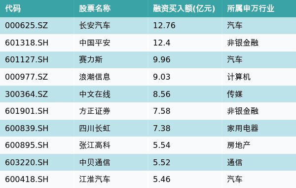 11月9日,两市共有3299只个股有融资资金买入,其中长安汽车、中国平安、赛力斯排名前三,买入金额分别12.76亿元、12.4亿元、9.96亿元。融资买入额前10个股详情见下表: