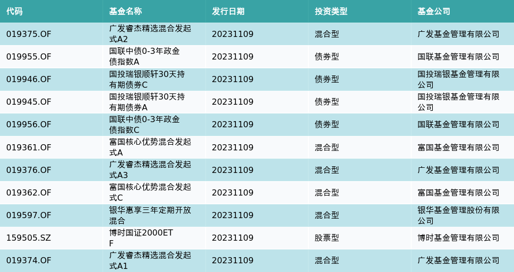 11月9日有11只新基金发行,分别为:广发睿杰精选混合发起式A2、国联中债0-3年政金债指数A、国投瑞银顺轩30天持有期债券C、国投瑞银顺轩30天持有期债券A、国联中债0-3年政金债指数C、富国核心优势混合发起式A、广发睿杰精选混合发起式A3、富国核心优势混合发起式C、银华惠享三年定期开放混合、博时国证2000ETF、广发睿杰精选混合发起式A1,详情见下表: