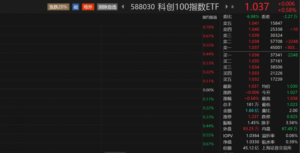 跟踪科创100(000698)规模最大的ETF——科创100指数ETF(588030)盘中V型反弹,逆势翻红,现涨0.58%。成交额突破1.6亿元,盘中溢价交易。