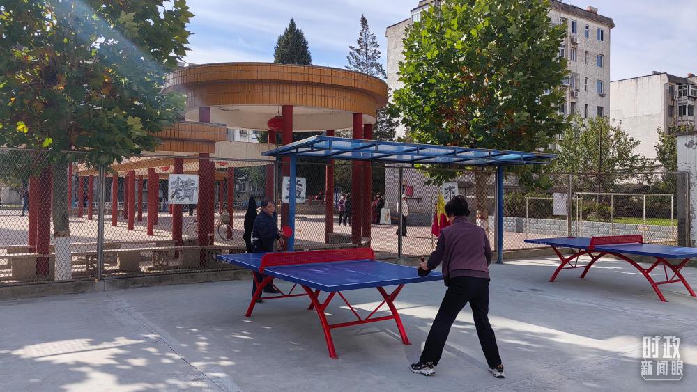 △ 涿州永济秀园小区里的居民正在户外打乒乓球。(总台央视记者王萌萌拍摄)