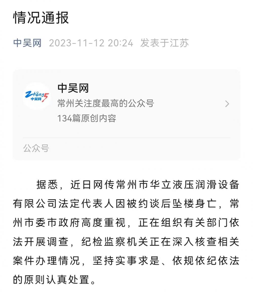 11月12日,据“中吴网”微信公众号消息:据悉,近日网传常州市华立液压润滑设备有限公司法定代表人因被约谈后坠楼身亡,常州市委市政府高度重视,正在组织有关部门依法开展调查,纪检监察机关正在深入核查相关案件办理情况,坚持实事求是、依规依纪依法的原则认真处置。
