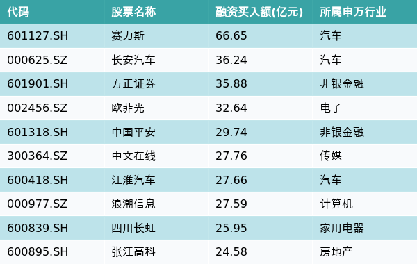上周两市共有3301只个股有融资资金买入,共有50只个股买入金额超10亿元,其中赛力斯、长安汽车、方正证券排名前三,买入金额分别66.65亿元、36.24亿元、35.88亿元。融资买入额前10个股详情见下表: