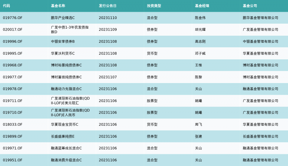 上周有13只新基金发行,分别为:鹏华产业精选C、广发中债1-3年农发债指数D、中银安享债券B、华夏沃利货币C、博时裕景纯债债券C、博时富信纯债债券C、融通动力先锋混合C、广发道琼斯石油指数(QDII-LOF)E美元现汇、广发道琼斯石油指数(QDII-LOF)E人民币、华夏现金宝货币C、长盛盛康纯债E、融通蓝筹成长混合C、融通消费升级混合C,详情见下表:
