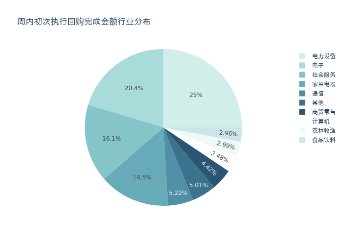 按照初次执行金额所在不同行业分布,金额最高的3个行业分别为:电力设备、电子、社会服务,详情见下图: