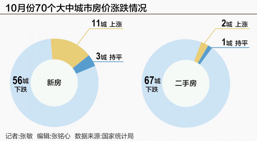 到今年10月,新房价格环比下跌的城市已达到56个,3城持平,11城房价上涨。二手房下跌的城市数量则达到67个,1城持平,仅杭州、三亚两地上涨。