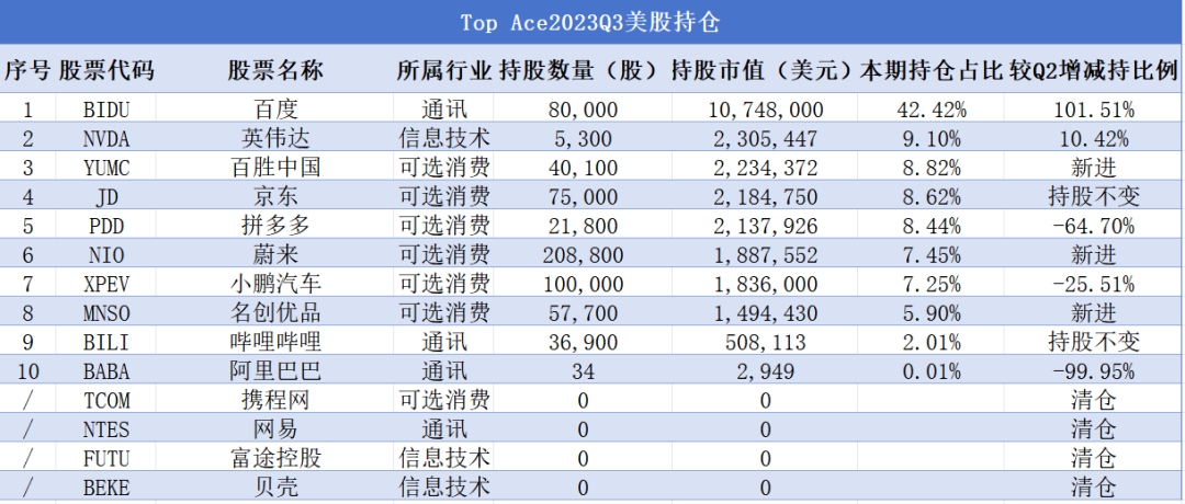 千合资本今年三季度也积极加码科技。SEC网站显示,截至三季度末,TOP ACE持有英伟达5300股,环比二季度末持股数量增加10.42%,持有百度8万股,持股数量环比二季度末翻倍。