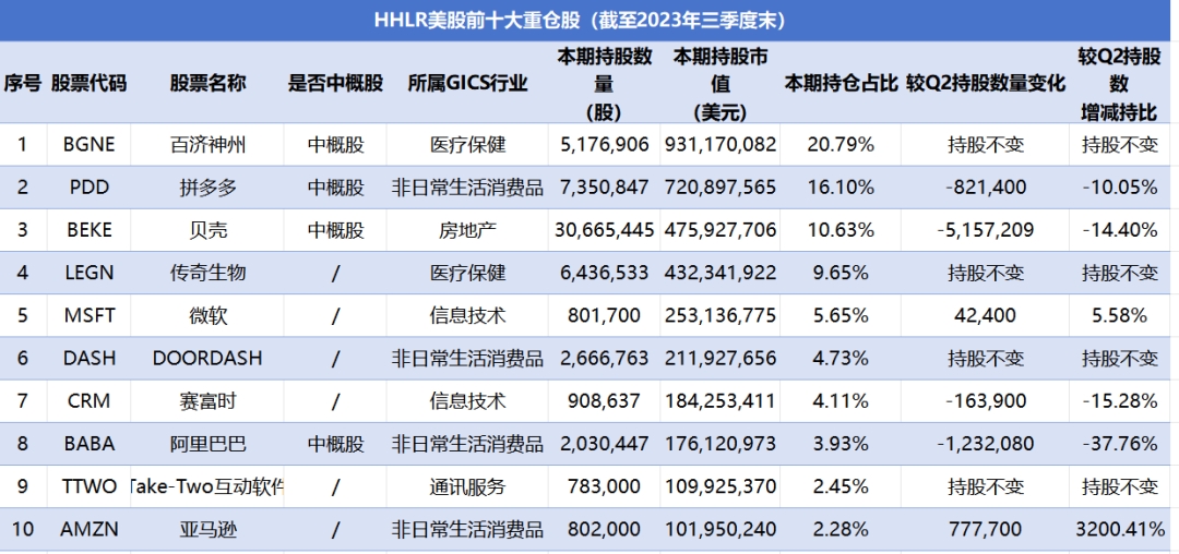 HHLR披露的美股持仓数据显示,截至三季度末,其前十大重仓股分别为百济神州、拼多多、贝壳、传奇生物、微软、DoorDash、赛富时、阿里巴巴、TAKE-TWO互动软件和亚马逊,科技股占据主导地位。从加仓方向来看,HHLR三季度增持了亚马逊、Roivant、微软、Boss直聘4只股票。