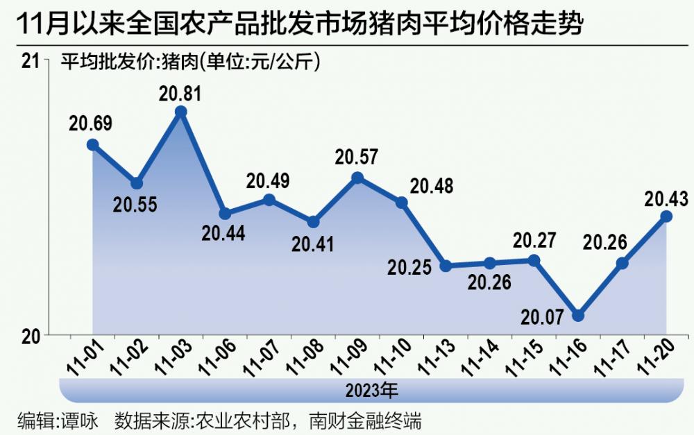 农业农村部披露数据显示,截至11月20日14:00,全国农产品批发市场猪肉平均价格为20.43元/公斤,比上周五上升0.8%。