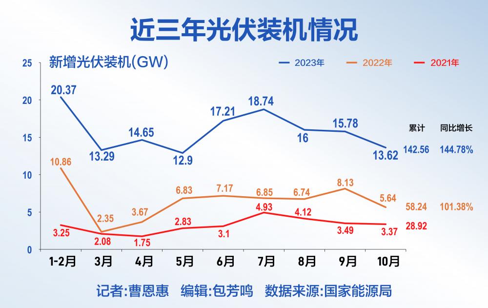 21世纪经济报道记者曹恩惠 上海报道 近日,国家能源局发布了1至10月份全国电力工业统计数据。其中,光伏发电新增装机容量约142.56GW,同比增长144.78%。截至10月底,全国光伏发电装机容量累计为5.36亿千瓦,同比增长47.0%,装机量占比为19.22%。