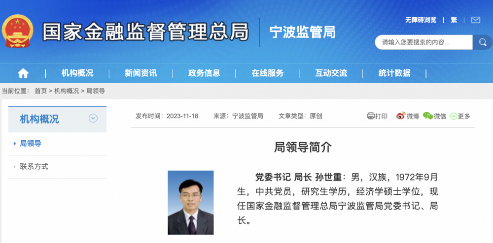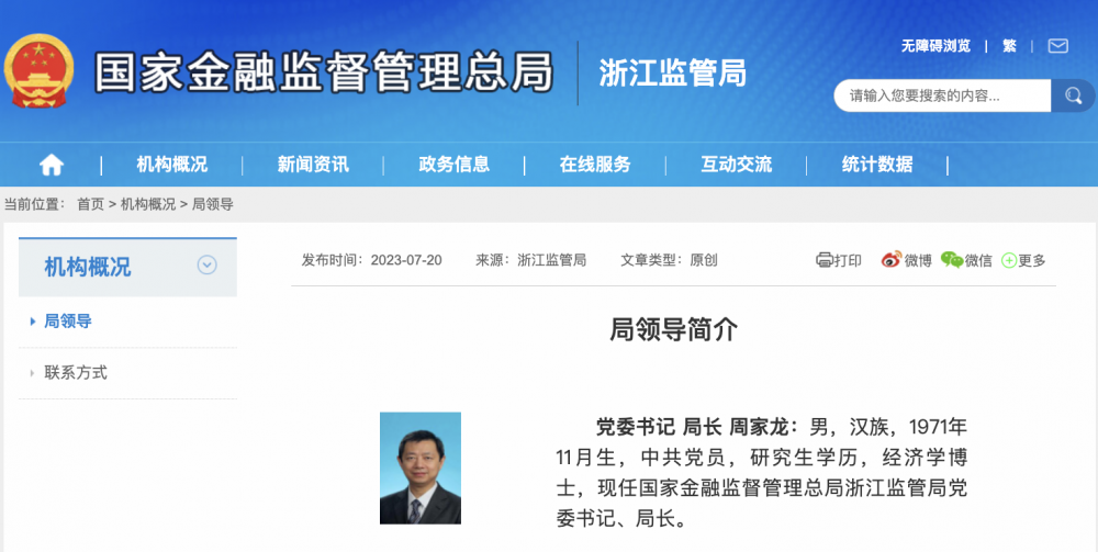国家金融监督管理总局浙江、安徽、宁波监管局官网披露,目前周家龙任浙江监管局党委书记、局长,覃刚任安徽监管局党委书记、局长,孙世重任宁波监管局党委书记、局长。