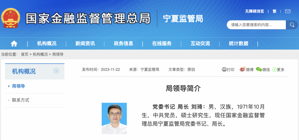 据国家金融监督管理总局宁夏监管局官网披露,目前刘琦任宁夏监管局党委书记、局长。公开信息显示,刘琦此前历任上海保监局党委委员、副巡视员、纪委书记,上海银保监局党委委员、副巡视员,上海银保监局党委委员、副局长。