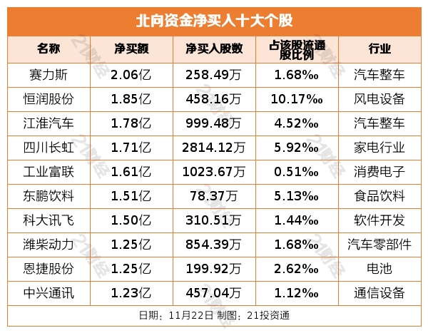 个股方面,北向资金净买入赛力斯(601127.SH)、恒润股份(603985.SH)、江淮汽车(600418.SH)、四川长虹(600839.SH)、工业富联(601138.SH)居前,其中,赛力斯被净买入2.06亿元,恒润股份被净买入1.85亿元,江淮汽车被净买入1.78亿元,四川长虹被净买入1.71亿元,工业富联被净买入1.61亿元。