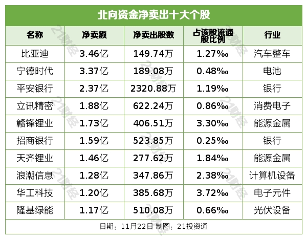 据21投资通智能监测,11月22日,北向资金净卖出35.39亿元,其中沪股通净卖出7.0亿元,深股通净卖出28.38亿元。