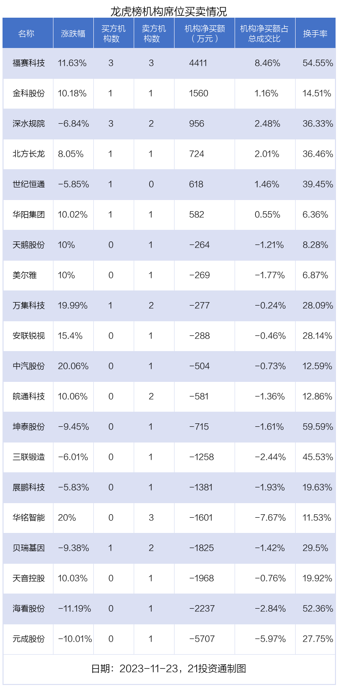 其中,机构净买入金额最多的是福赛科技(301529.SZ),当日收盘上涨11.63%,换手率为54.55%。