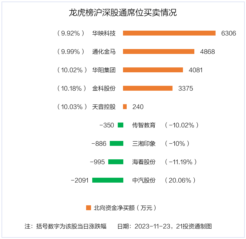 11月23日,上证指数上涨0.6%,深证成指上涨0.78%,创业板指上涨0.58%。盘后龙虎榜数据显示,共有44只个股因当日异动登上龙虎榜,资金净流入最多的是华映科技(000536.SZ),达1.87亿元。
