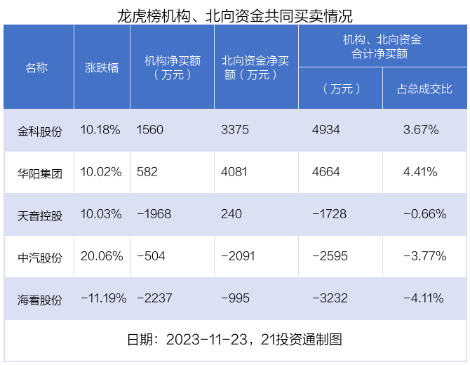 值得注意的是,机构和北向资金共同净买入了华阳集团、金科股份等2股;共同净卖出了海看股份、中汽股份等2股;在天音控股上出现分歧,机构净卖出天音控股1967.77万元,北向资金净买入239.88万元。