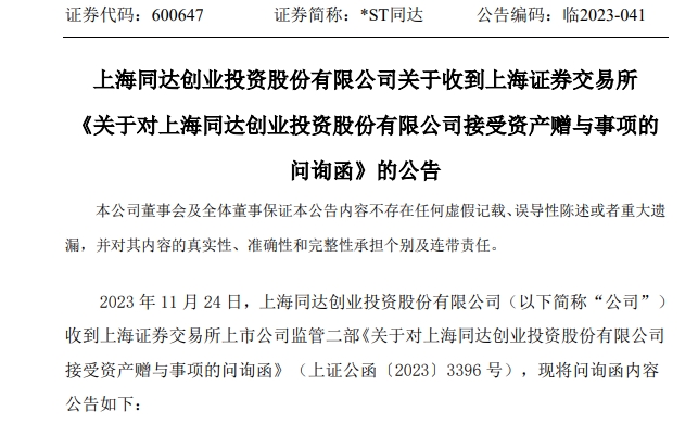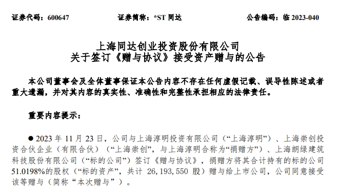 *ST同达11月24日晚间公告称,公司与上海淳明投资有限公司(下称“上海淳明”)、上海崇创投资合伙企业(有限合伙)(下称“上海崇创”)、上海朗绿建筑科技股份有限公司(下称“上海朗绿”)签订《赠与协议》,上海淳明、上海崇创将其合计持有的上海朗绿51.0198%的股权(共计2619.36万股)赠与上市公司,公司同意接受该等赠与。上述赠与零对价,为捐赠方的无偿且不可撤销的捐赠行为。