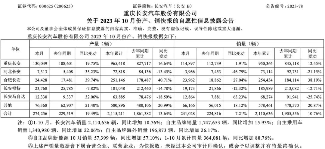 前10个月,长安汽车累计销量达211万辆,其中新能源自主品牌达到36万辆。