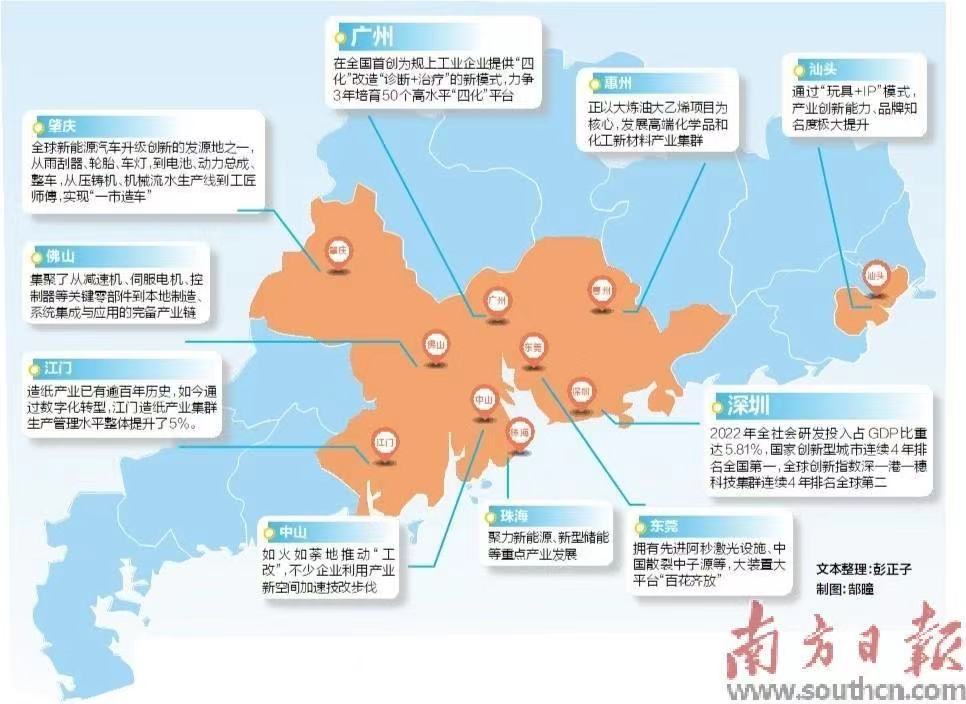 江门的造纸产业已有逾百年历史,如今通过数字化转型,江门造纸产业集群生产管理水平整体提升了5%。肇庆则成为全球新能源汽车升级创新的发源地之一,从雨刮器、轮胎、车灯,到电池、动力总成、整车,从压铸机、机械流水生产线到工匠师傅,实现“一市造车”;汕头通过“玩具+IP”模式,产业创新能力、品牌知名度极大提升。