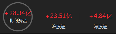 北向资金午后进场,全天净买入28.34亿元,早盘一度净卖出逾25亿元;其中沪股通净买入23.51亿元,深股通净买入4.84亿元。