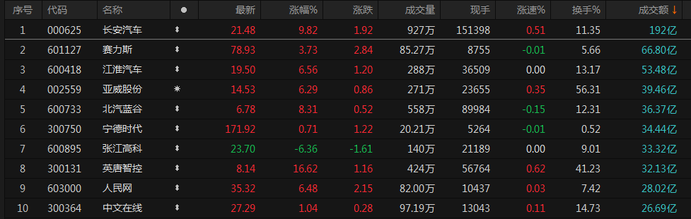 沪深两市今日成交额7728亿,较上个交易日缩量560亿。个股方面,长安汽车成交额192亿元居首,赛力斯、江淮汽车、亚威股份成交额居前。