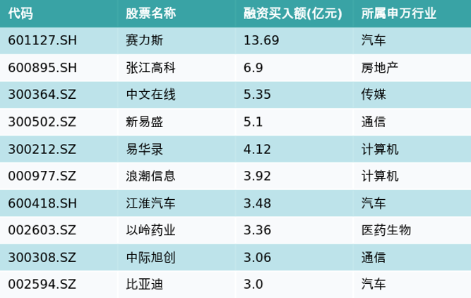 11月27日,两市共有3304只个股有融资资金买入,其中赛力斯、张江高科、中文在线排名前三,买入金额分别13.69亿元、6.9亿元、5.35亿元。融资买入额前10个股详情见下表: