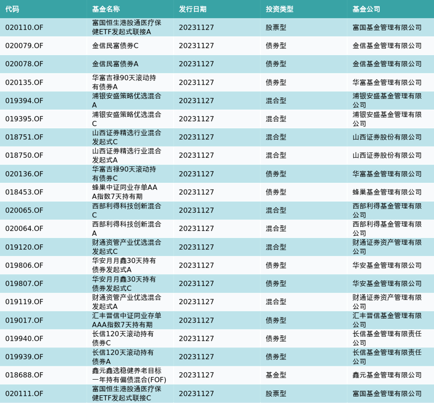 11月27日有21只新基金发行,分别为:富国恒生港股通医疗保健ETF发起式联接A、金信民富债券C、金信民富债券A、华富吉禄90天滚动持有债券A、浦银安盛策略优选混合A、浦银安盛策略优选混合C、山西证券精选行业混合发起式C、山西证券精选行业混合发起式A、华富吉禄90天滚动持有债券C、蜂巢中证同业存单AAA指数7天持有期、西部利得科技创新混合C、西部利得科技创新混合A、财通资管产业优选混合发起式C、华安月月鑫30天持有债券发起式A、华安月月鑫30天持有债券发起式C、财通资管产业优选混合发起式A、汇丰晋信中证同业存单AAA指数7天持有期、长信120天滚动持有债券C、长信120天滚动持有债券A、鑫元鑫选稳健养老目标一年持有偏债混合(FOF)、富国恒生港股通医疗保健ETF发起式联接C,详情见下表: