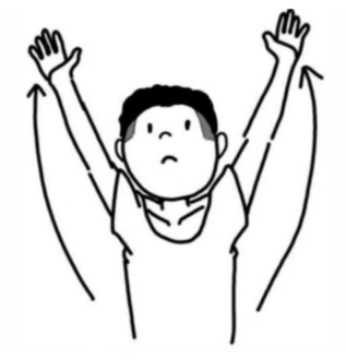 肘关节伸直,双手上举过于头顶,掌心朝上同时脑袋往后仰,目视双手手背,持续一段时间。
