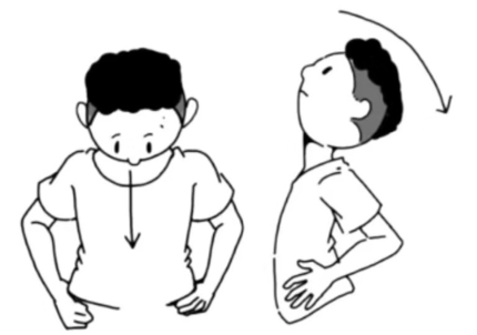 双手叉腰,肩膀放松,低头看地面将下巴向前胸靠近,然后回到中位,再抬头后仰,每个方向20次。