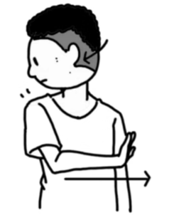 左手放手背后,右手放于前胸,右手掌心立起朝左边平行推出,同时头部转向右边保持5秒,再互换左右手,身体不要旋转。