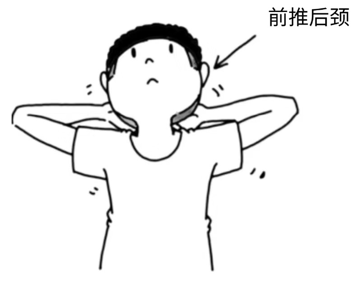 双手交叉紧贴于后颈部,然后向前推颈部同时头颈部向后用力,相互出力,保持5秒。