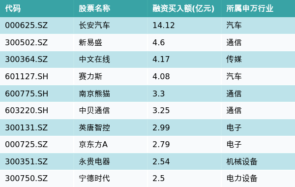 11月30日,两市共有3305只个股有融资资金买入,其中长安汽车、新易盛、中文在线排名前三,买入金额分别14.12亿元、4.6亿元、4.17亿元。融资买入额前10个股详情见下表: