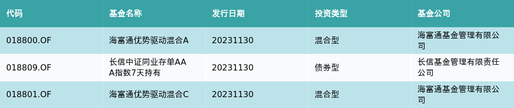 11月30日有3只新基金发行,分别为:海富通优势驱动混合A、长信中证同业存单AAA指数7天持有、海富通优势驱动混合C,详情见下表: