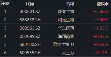 A股医药板块上午冲高回落。相关指数中,中证创新药产业指数(931152)走低,成分股多数下跌。截至发稿,康泰生物、和元生物逆势涨超3%,华东医药、海翔药业、君实生物-U、天士力小幅上涨。