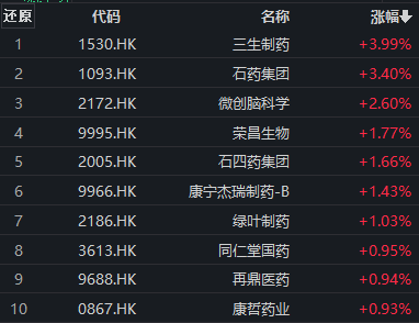 港股方面,医疗医药股涨跌互现。相关指数中,中证港股通医药卫生综合指数 (930965)小幅下跌。截至发稿,上涨成分股中,三生制药、石药集团涨超3%,微创脑科学涨逾2%,荣昌生物、石四药集团、康宁杰瑞制药-B、绿叶制药、同仁堂国药、再鼎医药、康哲药业等跟涨。