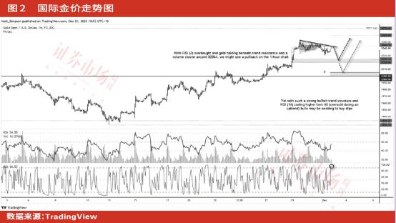 就技术分析来看,在黄金的一小时图上,强劲的看涨趋势非常明显。但我们可能需要考虑近期高点将面临“月末资金流动”的挑战。由于处于超买状态,而价格仍低于2044美元附近的HVN(高成交量节点)和趋势阻力位,我们怀疑随着黄金12月上涨的炒作消退,它可能会在月内出现回调。