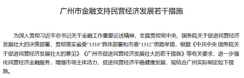 为深入贯彻落实中央关于强化金融支持民营经济发展壮大有关工作要求,全面落实省委“1310”具体部署和市委“1312”思路举措,依据《广州市促进民营经济发展壮大的若干措施》,结合我市实际,市地方金融监管局、中国人民银行广东省分行营业管理部、国家金融监督管理总局广东监管局、中国证券监督管理委员会广东监管局、广州市工业和信息化局等五部门联合出台《广州市金融支持民营经济发展若干措施》(以下简称《若干措施》),进一步强化民营经济金融服务,增强市场主体活力,促进民营经济平稳健康发展。