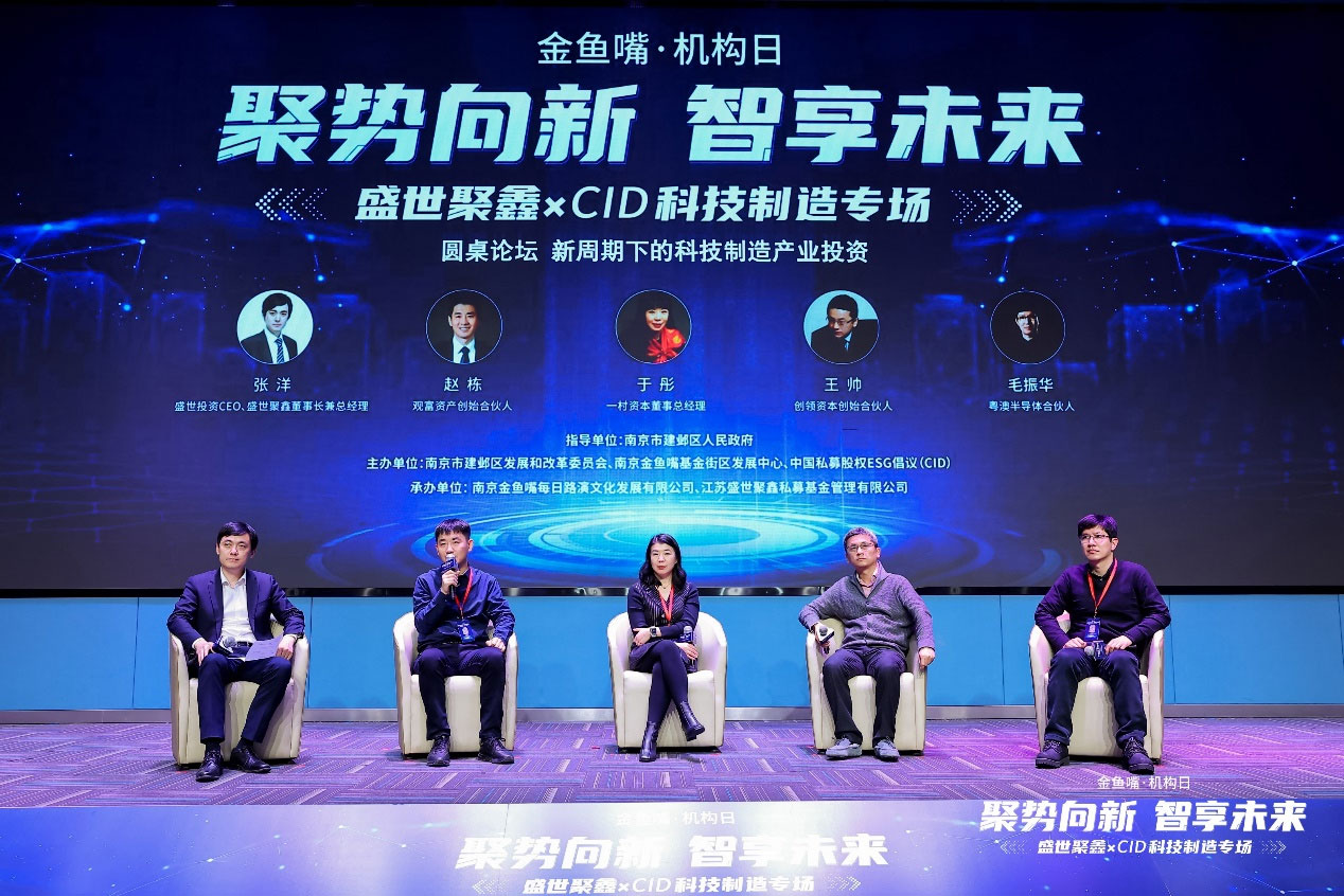 12月5日,金鱼嘴·机构日——盛世聚鑫×CID科技制造专场活动在南京建邺区举办。活动由南京市建邺区人民政府指导,南京市建邺区发展和改革委员会、南京金鱼嘴基金街区发展中心、私募股权行业ESG倡议(CID)主办,南京金鱼嘴每日路演文化发展有限公司、江苏盛世聚鑫私募基金管理有限公司承办。盛世投资CEO、江苏盛世聚鑫董事长兼总经理张洋、观富资产创始合伙人赵栋、一村资本董事总经理于彤、创领资本创始合伙人王帅及粤澳半导体合伙人毛振华等嘉宾出席“新周期下的科技制造产业投资”圆桌,眺望科技制造的行业风口,展望股权投资的发展先机。