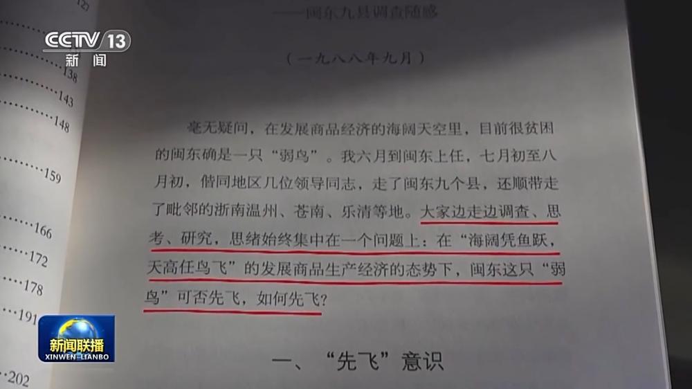 在一个多月里,习近平去了古田、屏南等9个县的13个乡镇、18个村。随后,他在《弱鸟如何先飞》这篇文章里写道:大家边走边调查、思考、研究,思绪始终集中在一个问题上,在“海阔凭鱼跃,天高任鸟飞”的发展商品生产经济的态势下,闽东这只“弱鸟”可否先飞,如何先飞?
