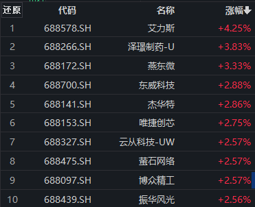 医药生物、电子板块早盘局部拉升。相关指数中,重仓该两大行业的科创100指数小幅走高,成分股涨跌互现。上涨个股中,艾力斯涨超4%,泽璟制药-U、燕东微涨逾3%,东威科技、杰华特、唯捷创芯、云从科技-UW、萤石网络、博众精工、振华风光等跟涨。